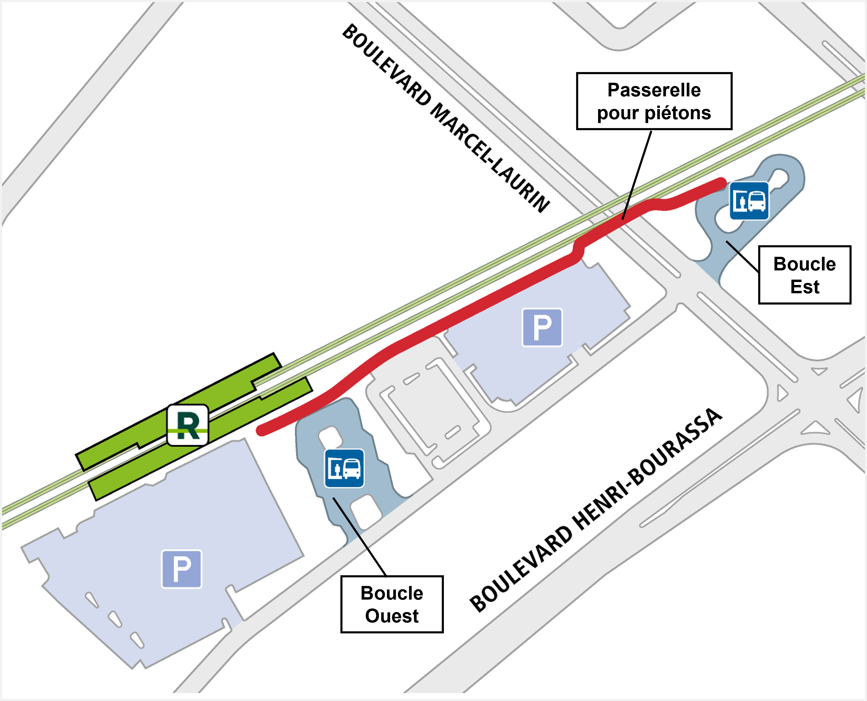 À la station REM Bois-Franc : débarquement dans la boucle Ouest et embarquement dans la boucle Est (quai 2 – boucle Est située de l’autre côté du boulevard Marcel-Laurin à environ 300 mètres de la station REM, soit environ 4 minutes de marche – empruntez la passerelle piétonnière qui passe au-dessus du boulevard). Voir le plan du terminus Bois-Franc